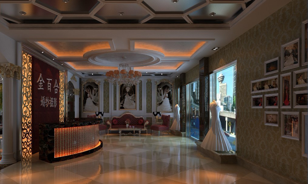 以視覺的唯美店堂和作品的張力共同撞擊顧客挑剔的眼球。唯美是影樓家具所追求的效果,也是顧客需要的。從任何角度講,唯美本身沒有錯,但是應用在裝修和空間應用上,經常導致視覺上很不舒服。唯美風格,可以在你的店堂內架構一個吸引人的核心,比較個性的展示柜也好,珠寶柜也好,鋼琴也行,淺色的就可以,位置一般在比較正的地方,但要注意,不能與前臺相沖突。有了這樣一個中心,布光就可以有的放矢了,這樣做的好處是讓你的影樓給客人一個很好的第一印象,也可以減少店堂的燈光數量,還能達到同樣照明效果,一舉三得。